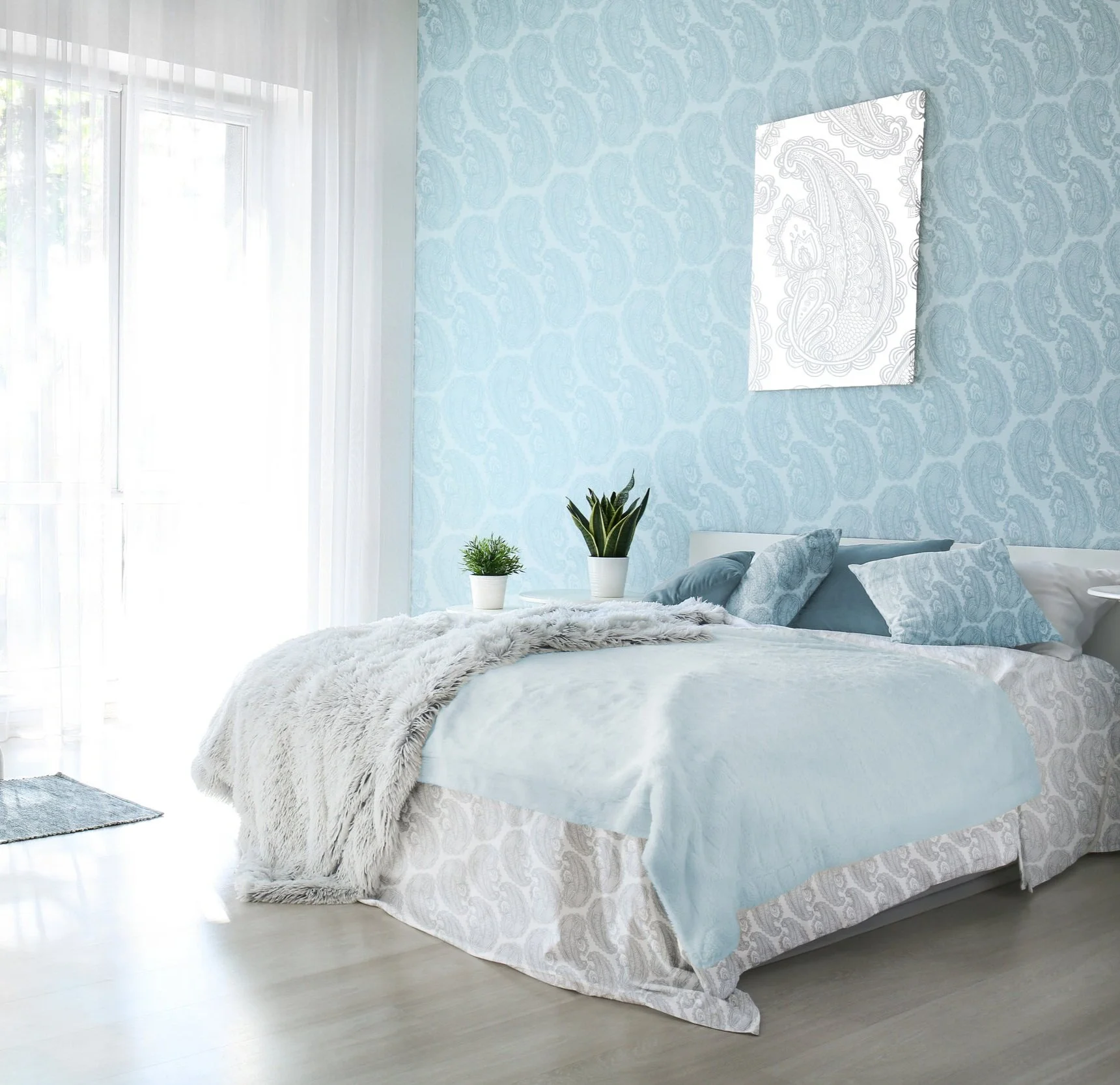 Pictured above: Blue Paisley Wall Hanging (available in two sizes), Comforter, Pillow shams, and Square Throw Pillow.